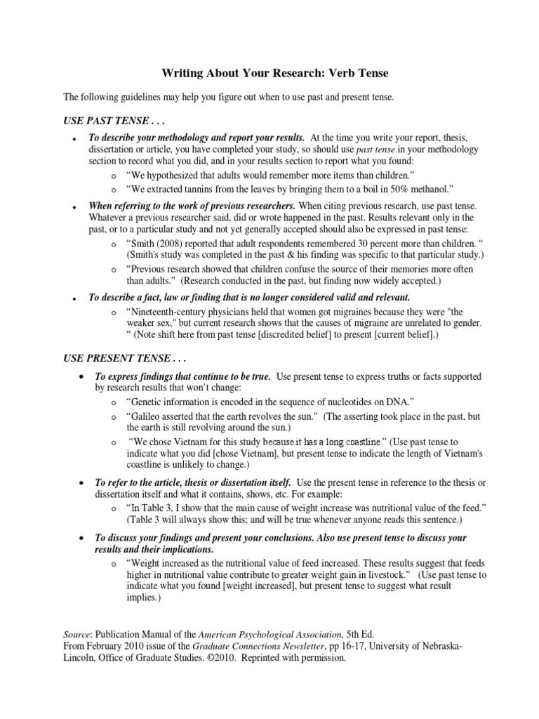 When describing the outcomes of past research with verbs writing dissertation tense fi nddiscover or demonstrateyou can use either the past simple or the present perfect. The present perfect is a good choice to emphasize the continuing relevance of a piece of research and its consequences for your own work. It implies that the current research will build on, follow from, writing dissertation tense, or respond to what previous researchers have done.